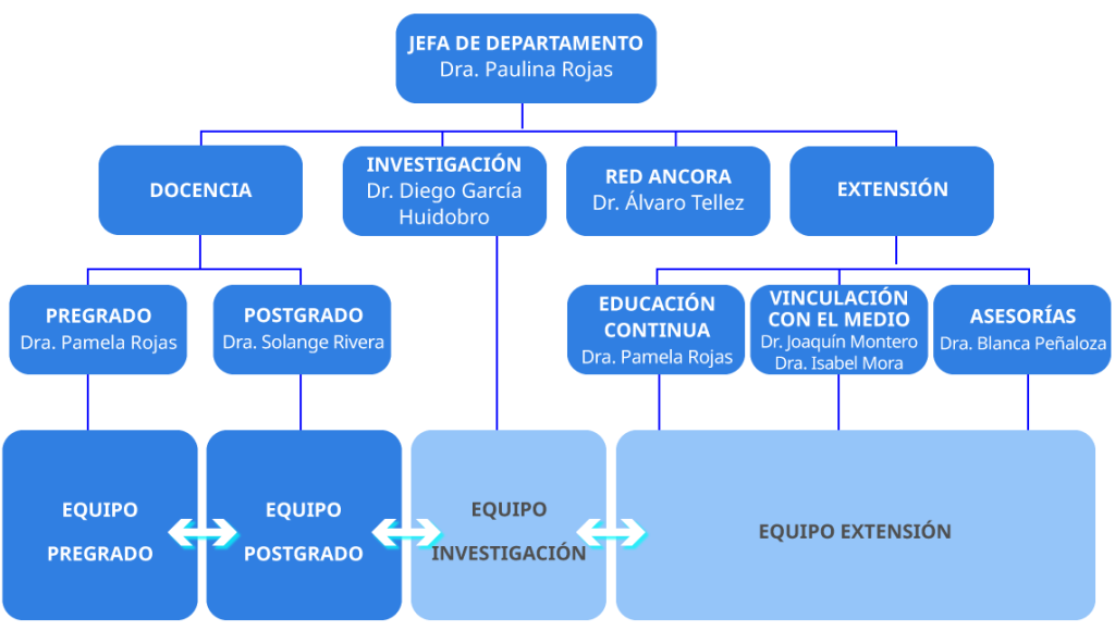 A enero 2023, el equipo del Departamento de Medicina Familiar UC está conformado por 28 académicos, y se organiza en 4 grandes áreas de trabajo (Fig.1).