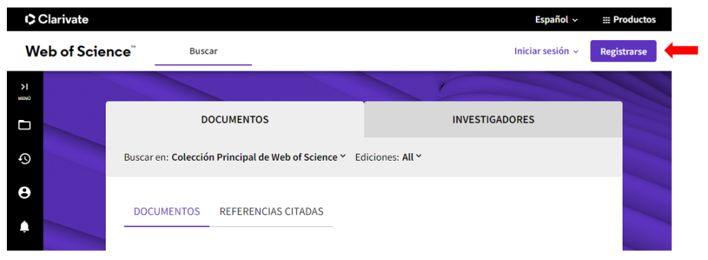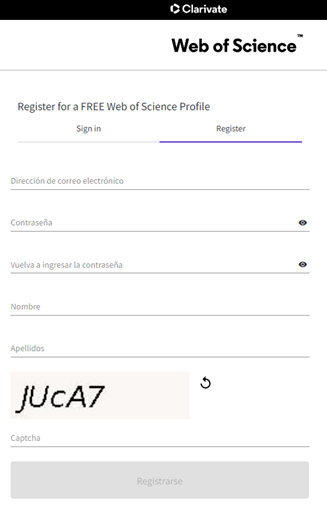Si no tiene cuenta en Clarivate Web of Science hacer click en el botón Registrarse (Register en la versión en inglés).