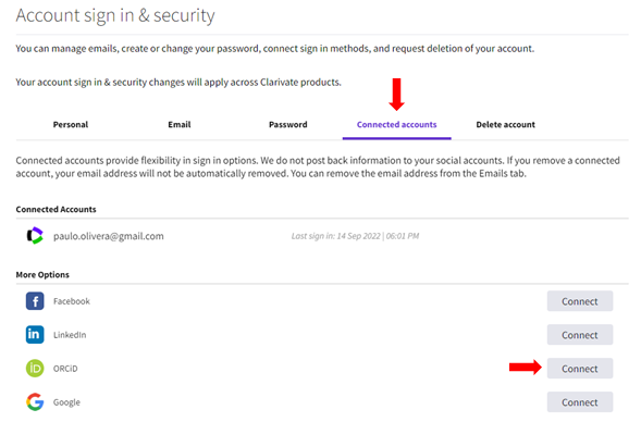 Aparecerá un menú en inglés donde se debe hacer clic en la opción Connected accounts y luego buscar el botón conectar con ORCID, para finalmente hacer clic en el botón de Autorizar acceso.